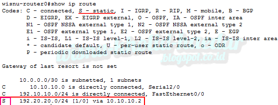 Jadi, sekarang kita daftarkan network 192.20.20.0/24 dalam table routing router0 secara manual atau dengan statik :